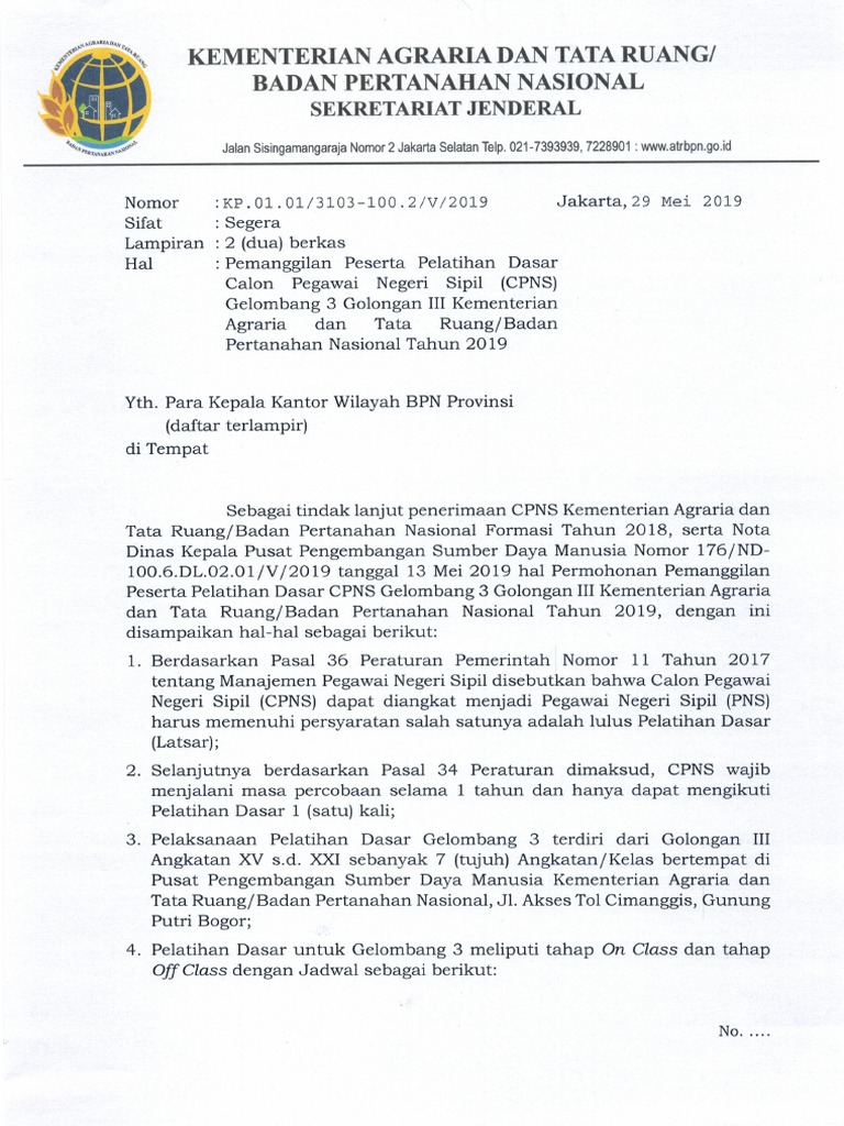 Surat Pemanggilan Diklatsar Gelombang 3 Atr Bpn Pdf